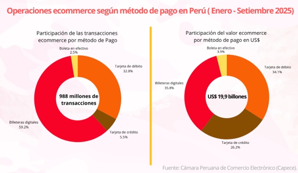 En términos de volumen, el ecommerce movió US$ 19,9 mil millones en los primeros nueve meses del 2025. De este total, el 35,8% (US$ 7,1 mil millones) corresponden a las billeteras digitales, siendo el medio de pago que más ha crecido en el ecommerce.