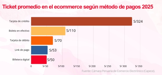¿Qué tipo de Método de pago tiene mayor ticket promedio en el ecommerce? De acuerdo a CAPECE, el ticket promedio más alto lo tiene las tarjetas de crédito no presente, con S/324. Le sigue cupones o boletos en efectivo, con S/ 110, Mientras que los más bajos lo tienen las billeteras digitales (S/50), link de pago (S/53) y la tarjeta de débito, (S/70).