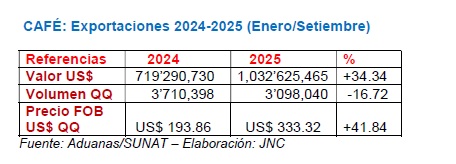 La campaña cafetalera del 2025 cerrará con resultados favorables, al estimarse un valor de exportaciones superiores a US$ 1,600 millones de dólares, con destino a 50 países ubicados en Europa, Asia, Norteamérica América del Norte, inclusive a 7 países latinoamericanos.